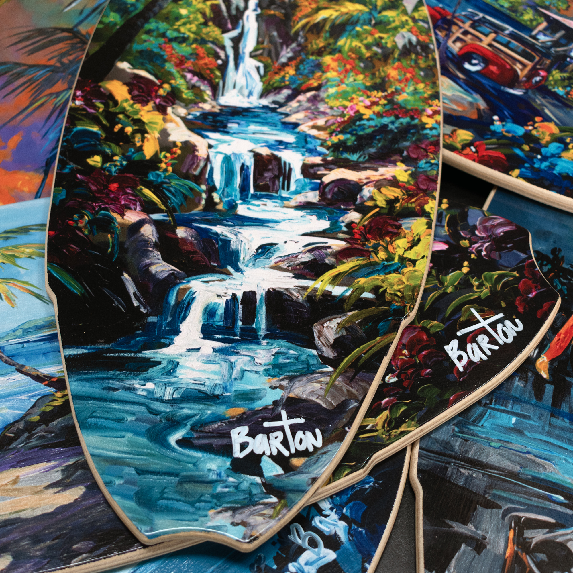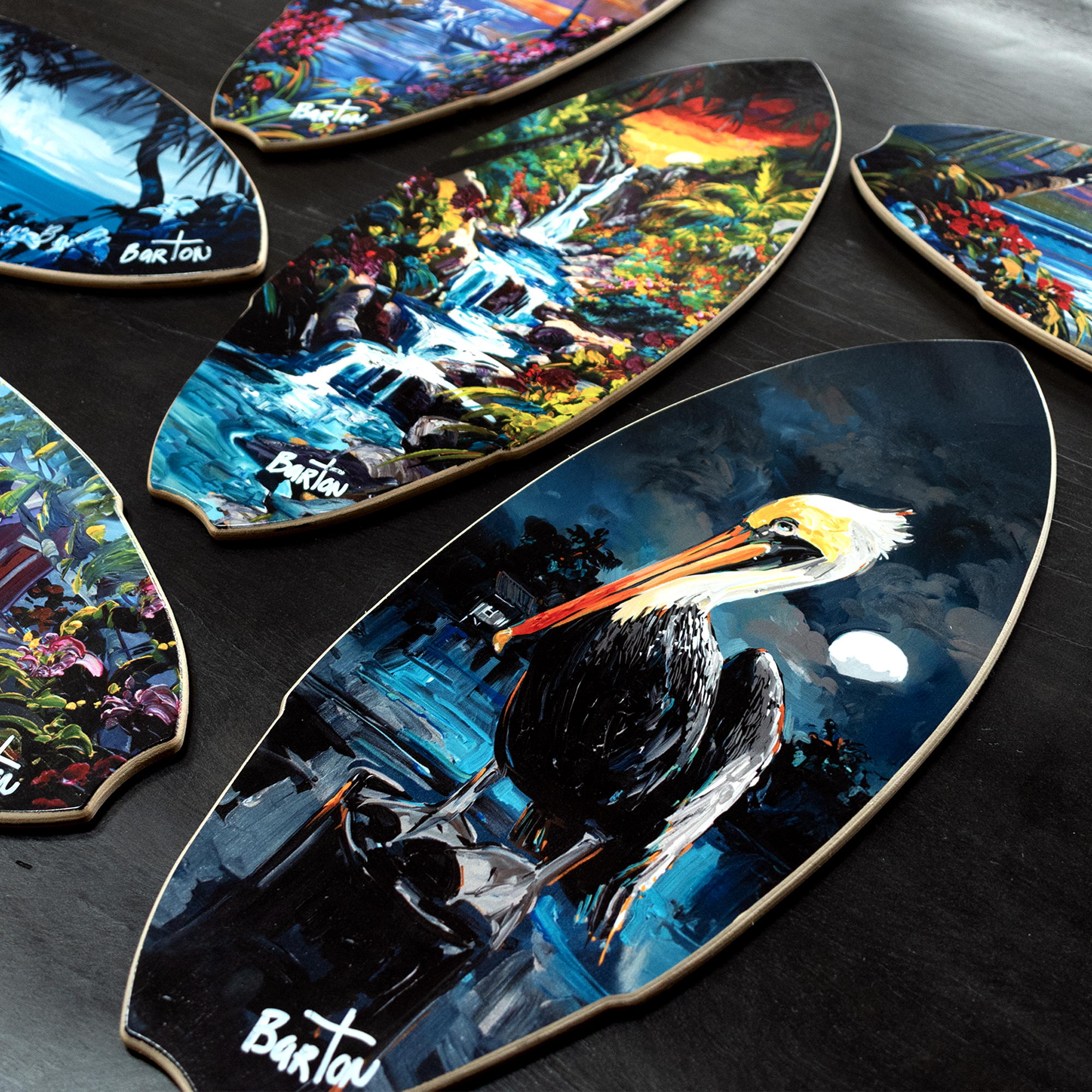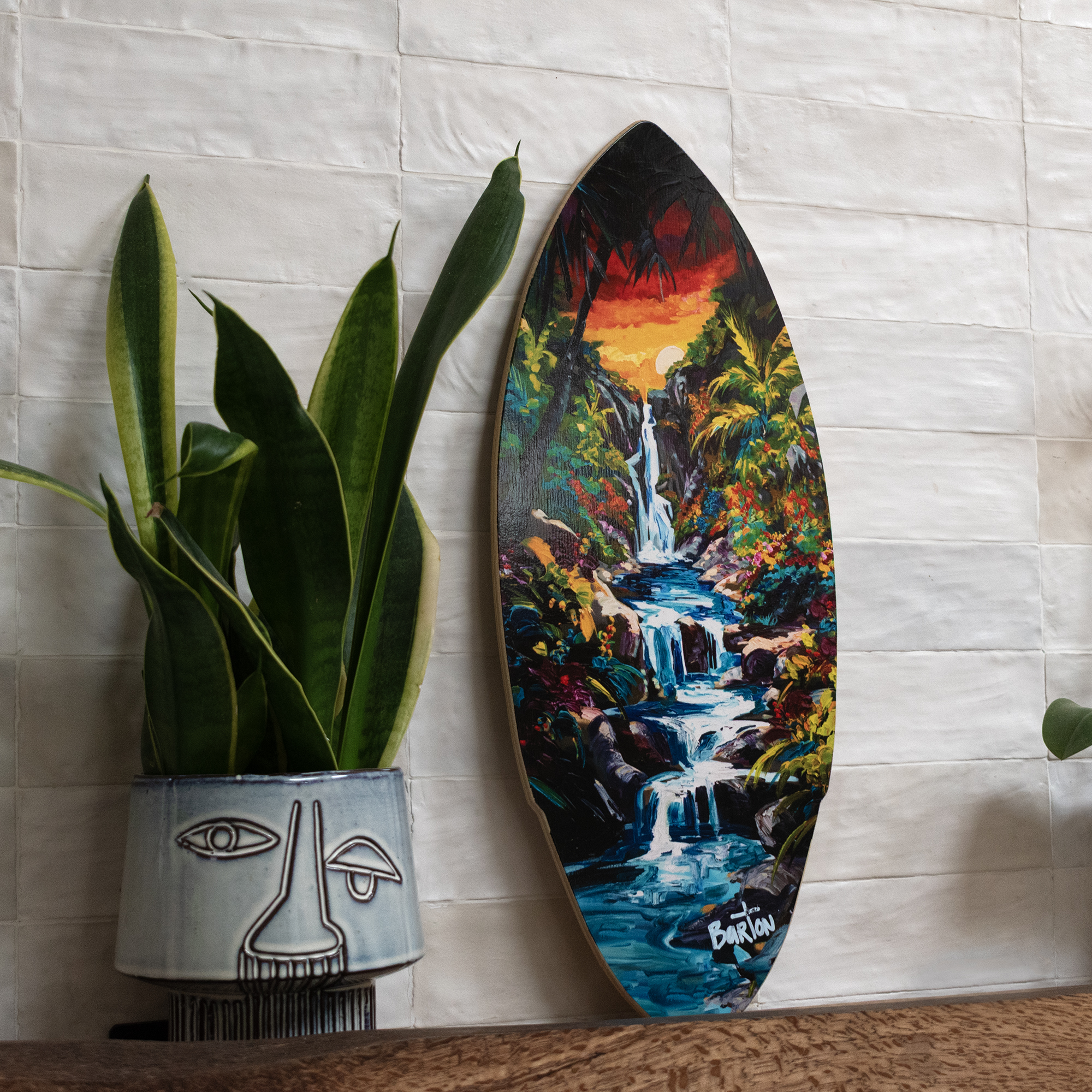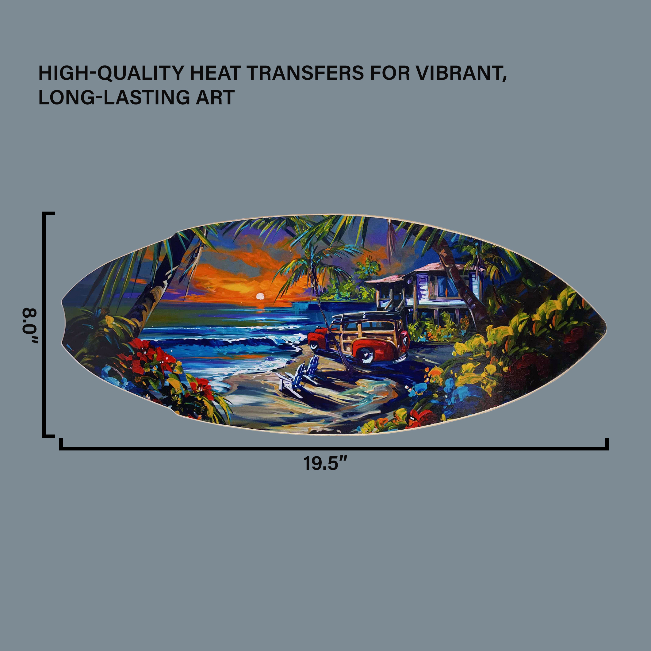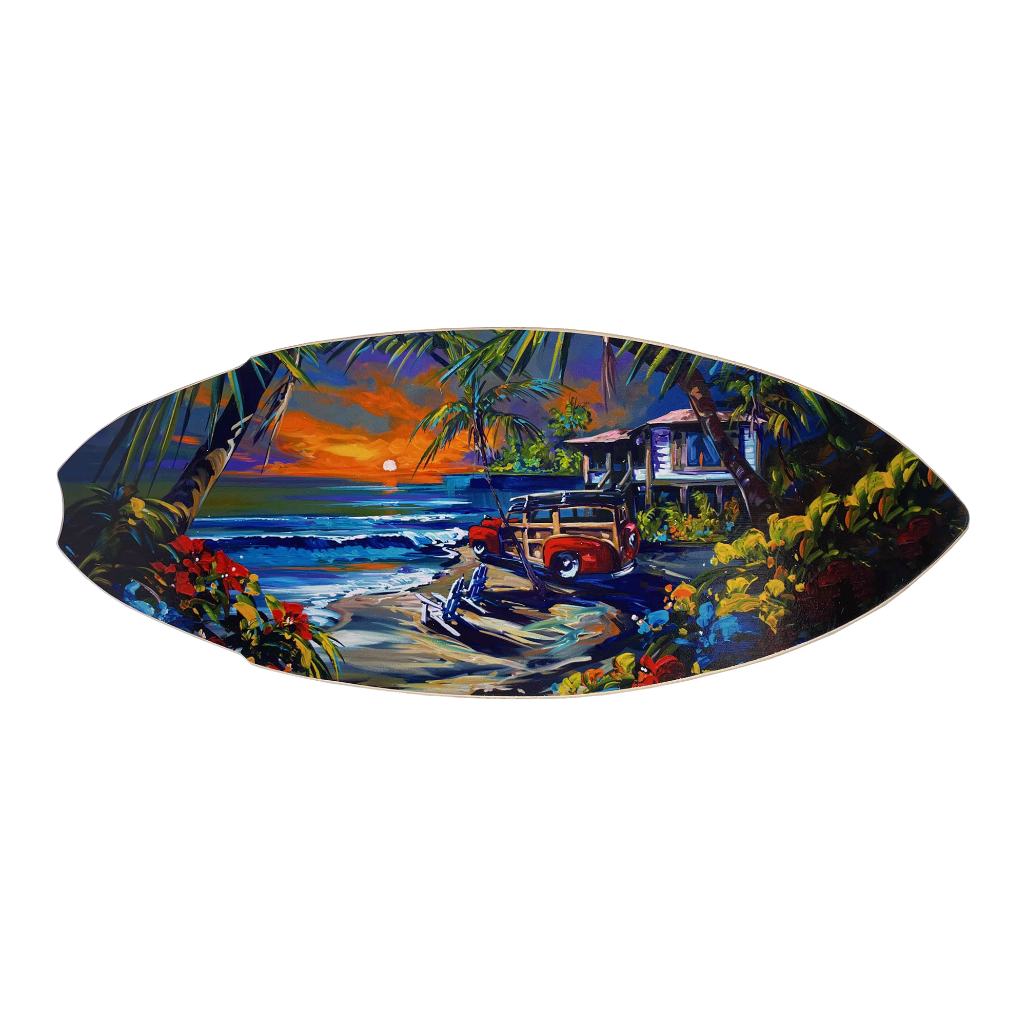 Add a touch of coastal charm with this beautiful mini surfboard art print. Each piece features a high-quality heat transfer on solid wood and is hand-signed by Steve Barton. Perfect as a unique home accent or thoughtful gift.Size: 8″ x 19.5″